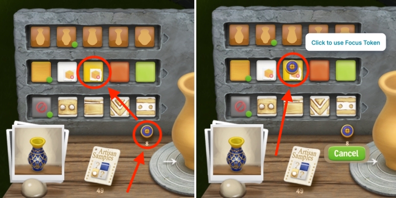 1. Click on the Focus Token icon | 2. Click on a Glaze or Pattern to change it into that particular one